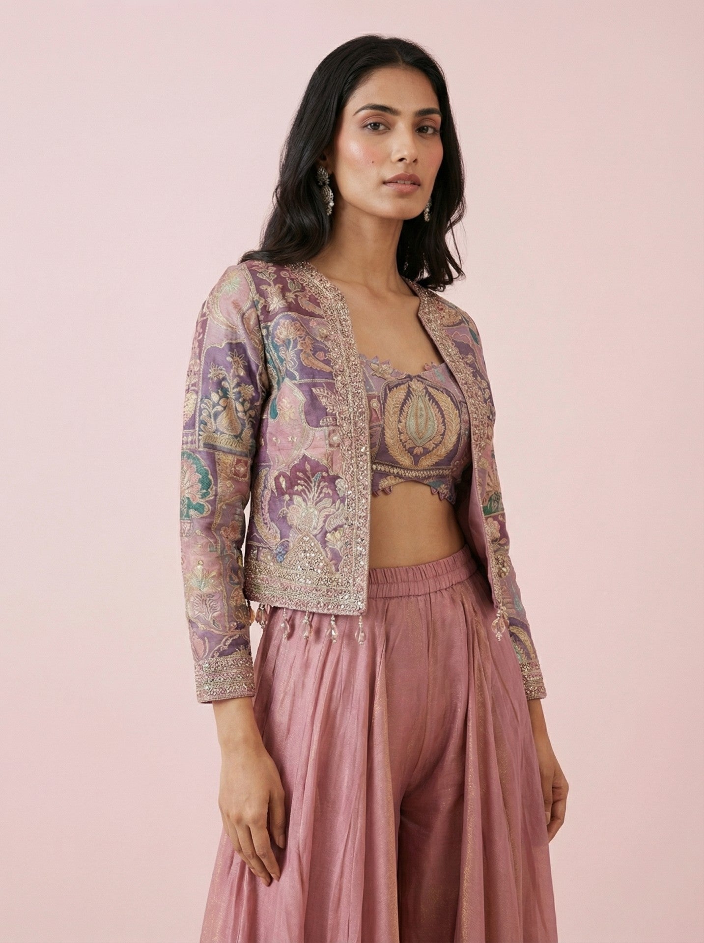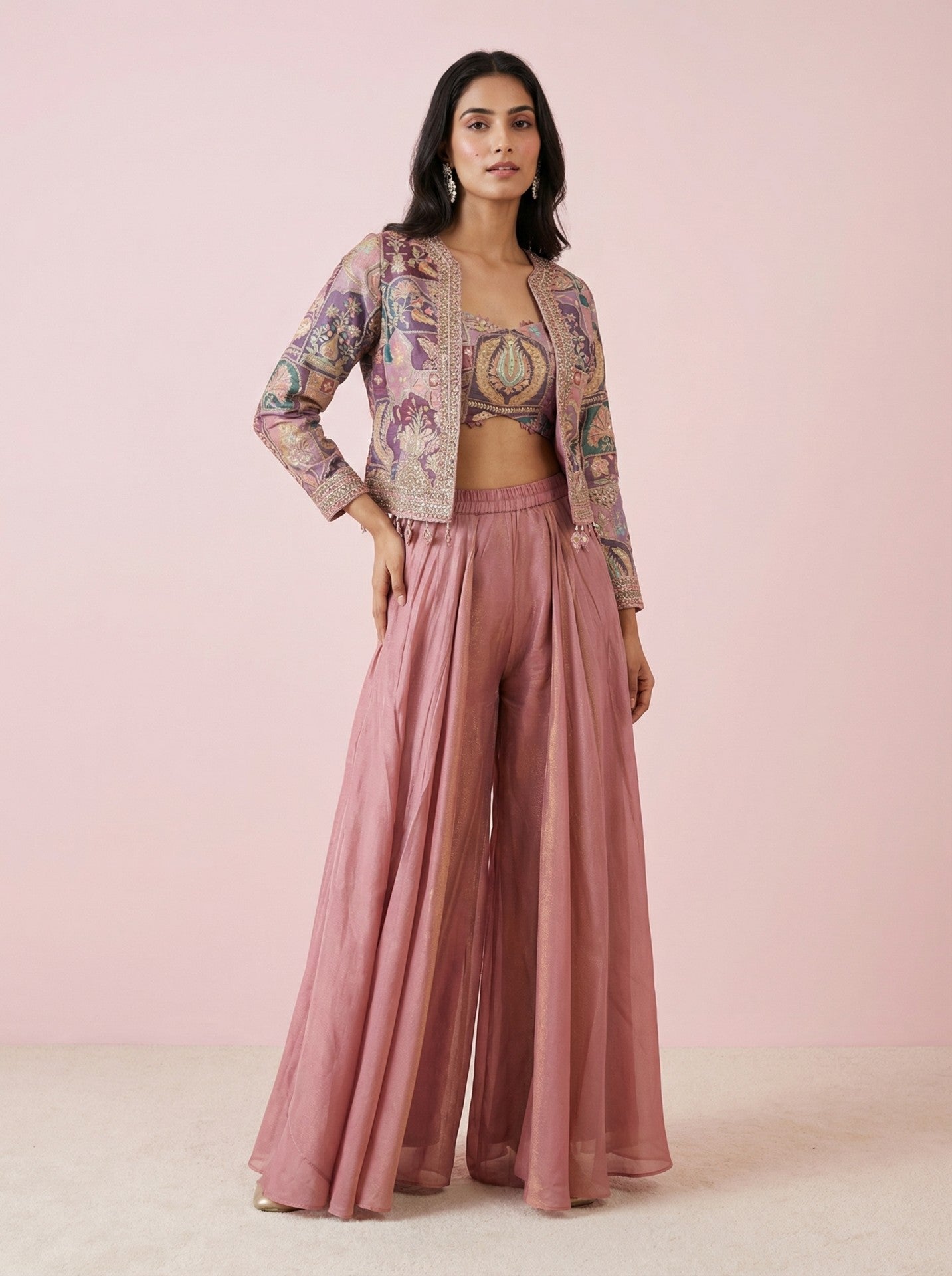 Peach Embroidered Sharara Indowestern With Crop Top & Jacket