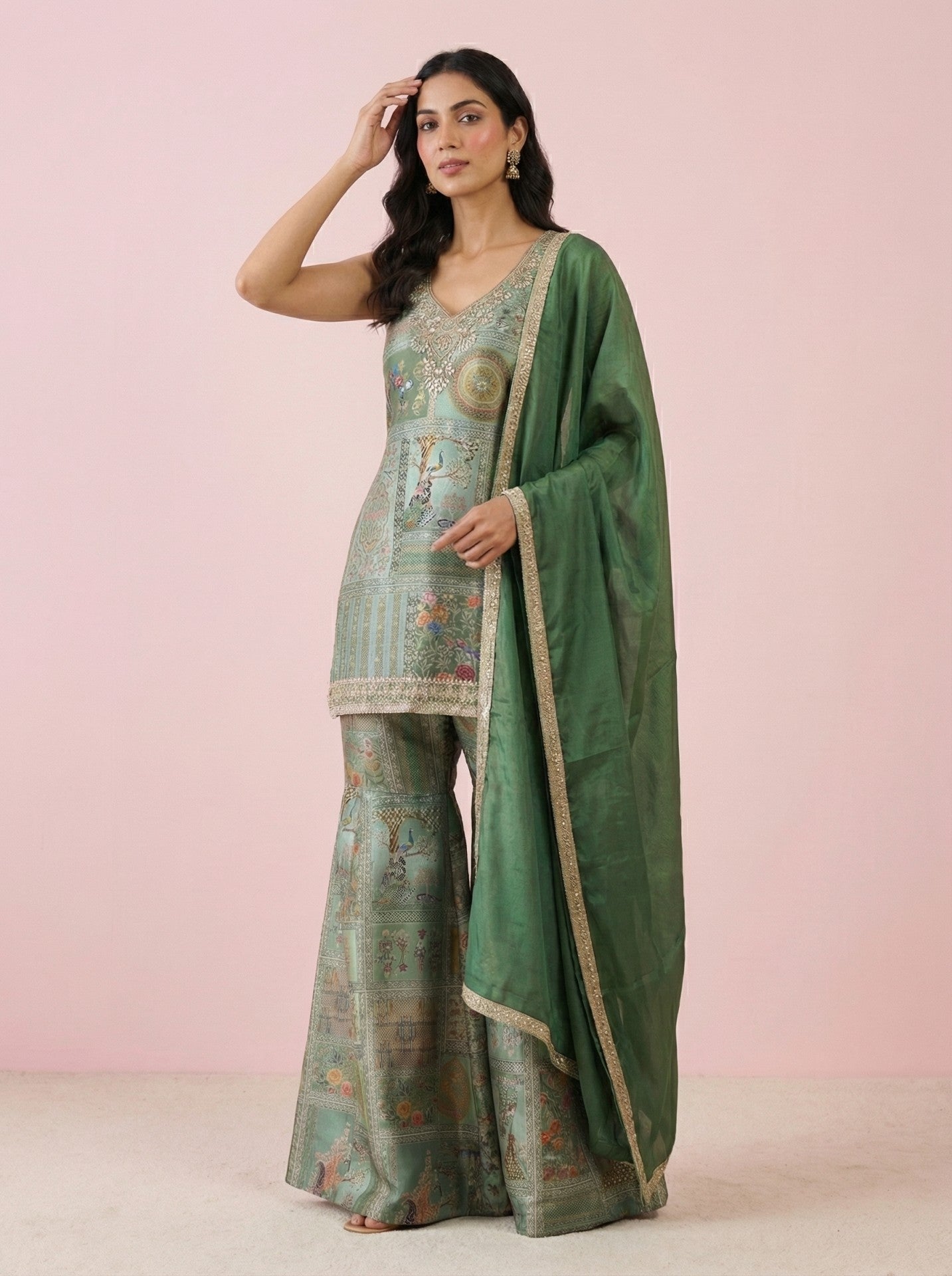 Digital Printed Green Festive Sharara Suit