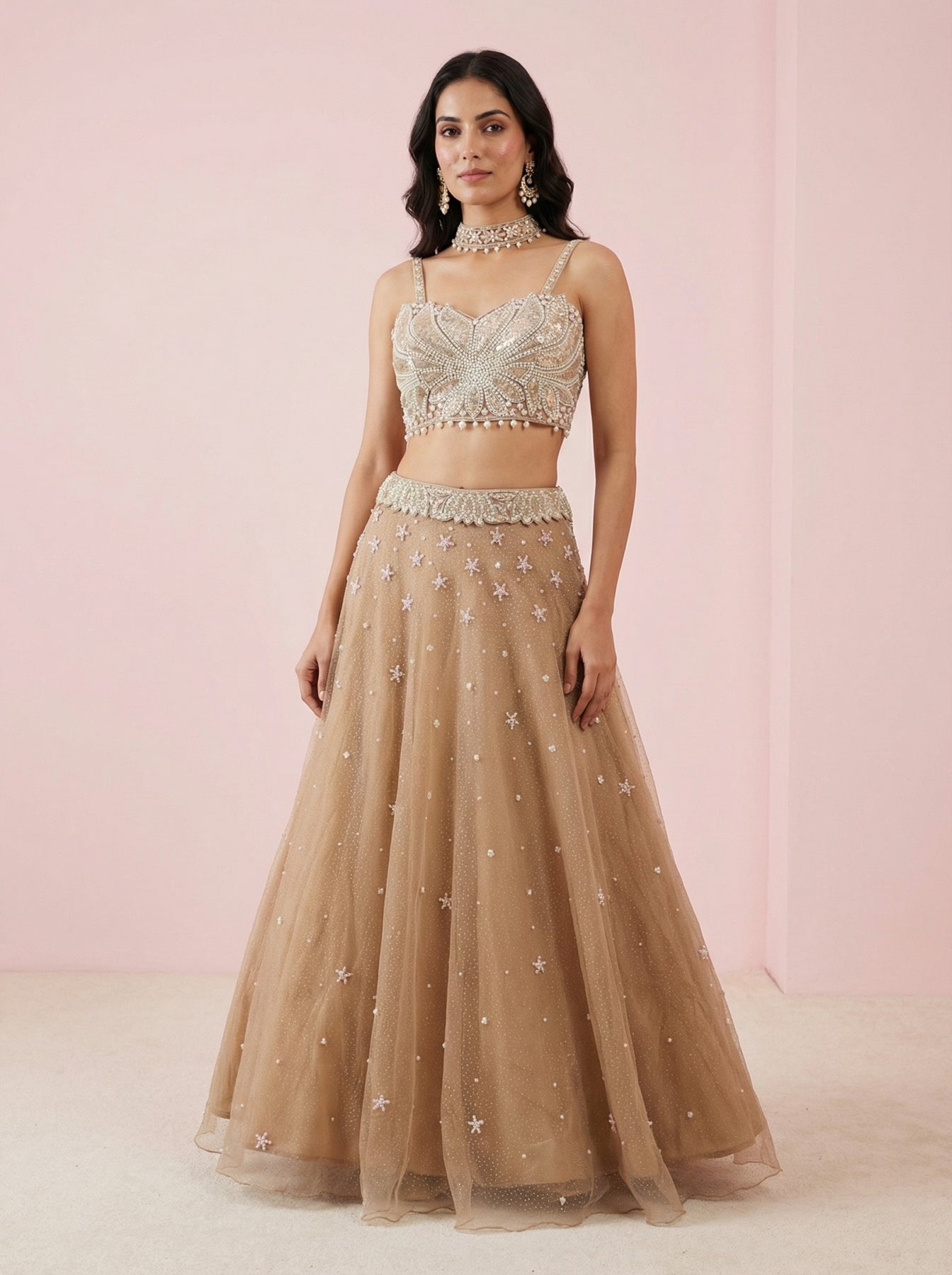 • Brown Net Designer Crop Top Lehenga