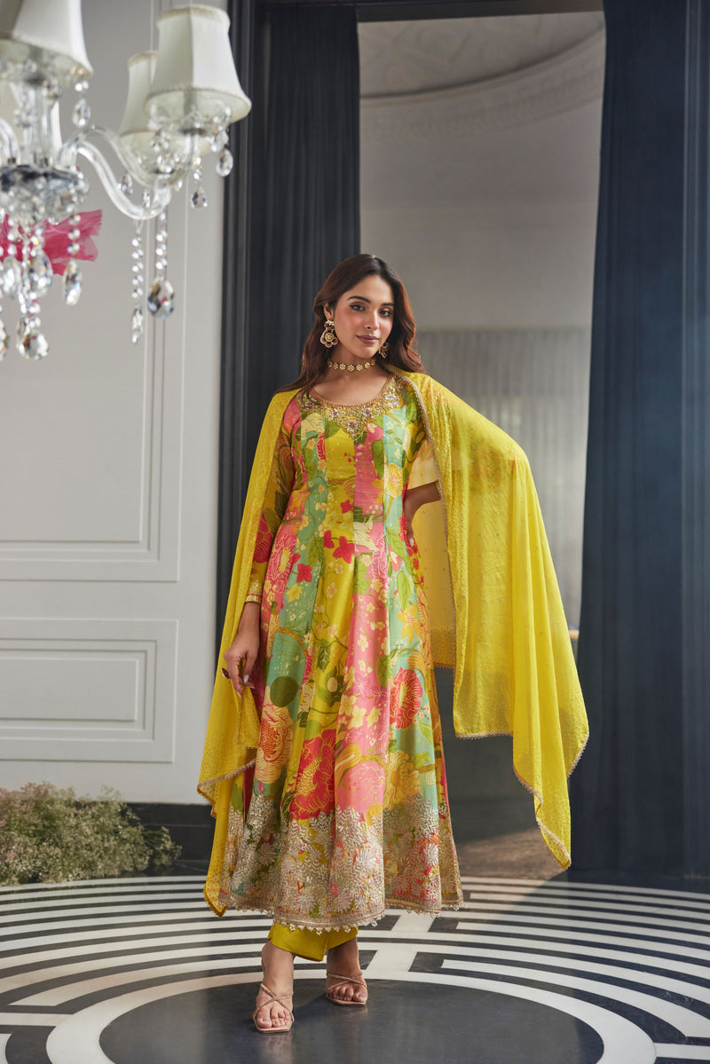 Add a burst of color and grace to your wardrobe with our Floral Fusion Anarkali Set, an enchanting ensemble that celebrates femininity and tradition with a modern twist. The Anarkali features a vibrant, multi-colored floral print on a luxurious fabric base, beautifully enhanced with intricate embroidery and sequin work along the hemline. Paired with straight-cut pants and a bright yellow dupatta adorned with delicate embellishments, this outfit is the perfect balance of elegance and statement style. Ideal for festive occasions, mehndi , Haldi functions, or daytime celebrations, this set brings effortless glamour to every step you take.