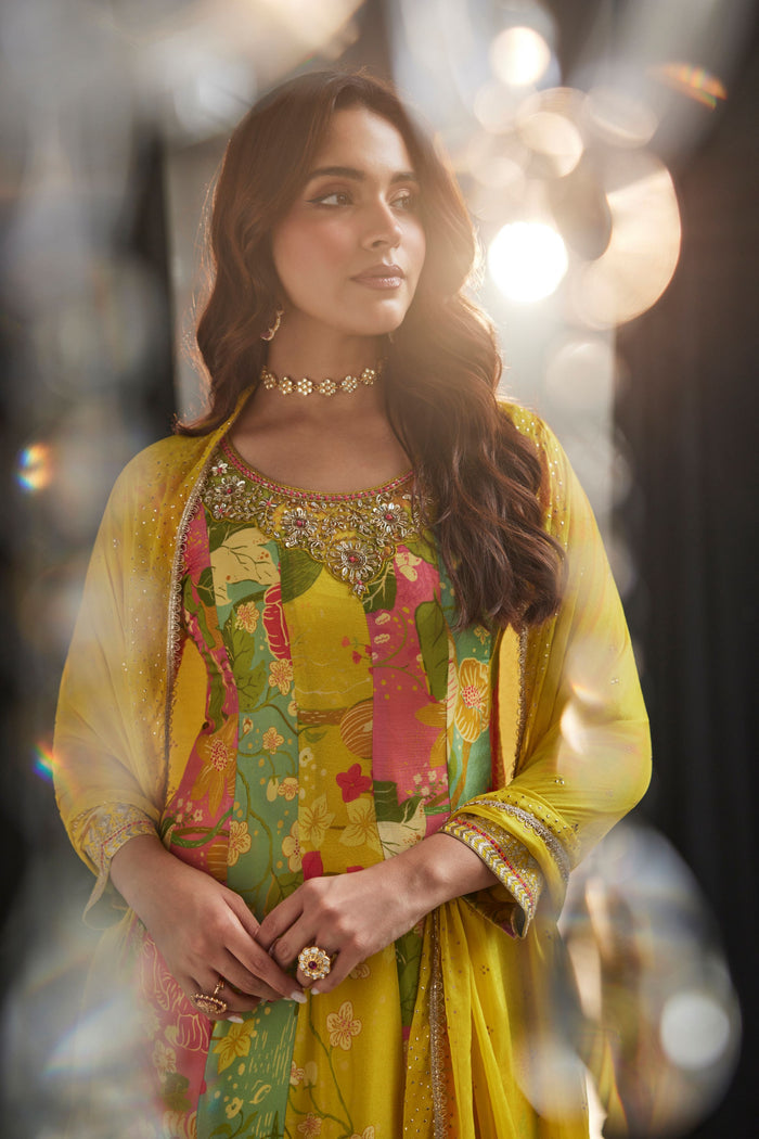 Color: Multicolor floral print with yellow accents3-piece set: Anarkali kurta, matching pants, and embellished dupatta