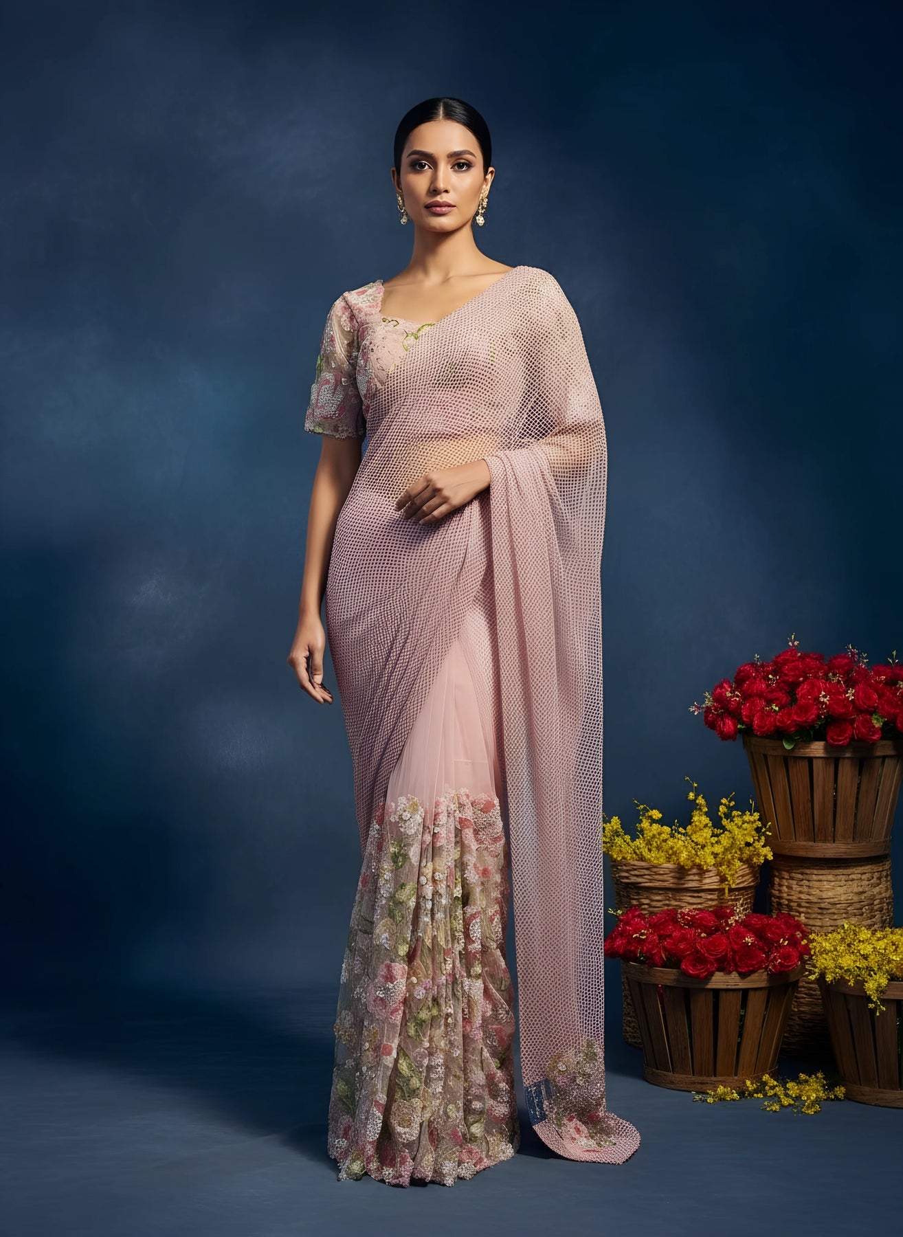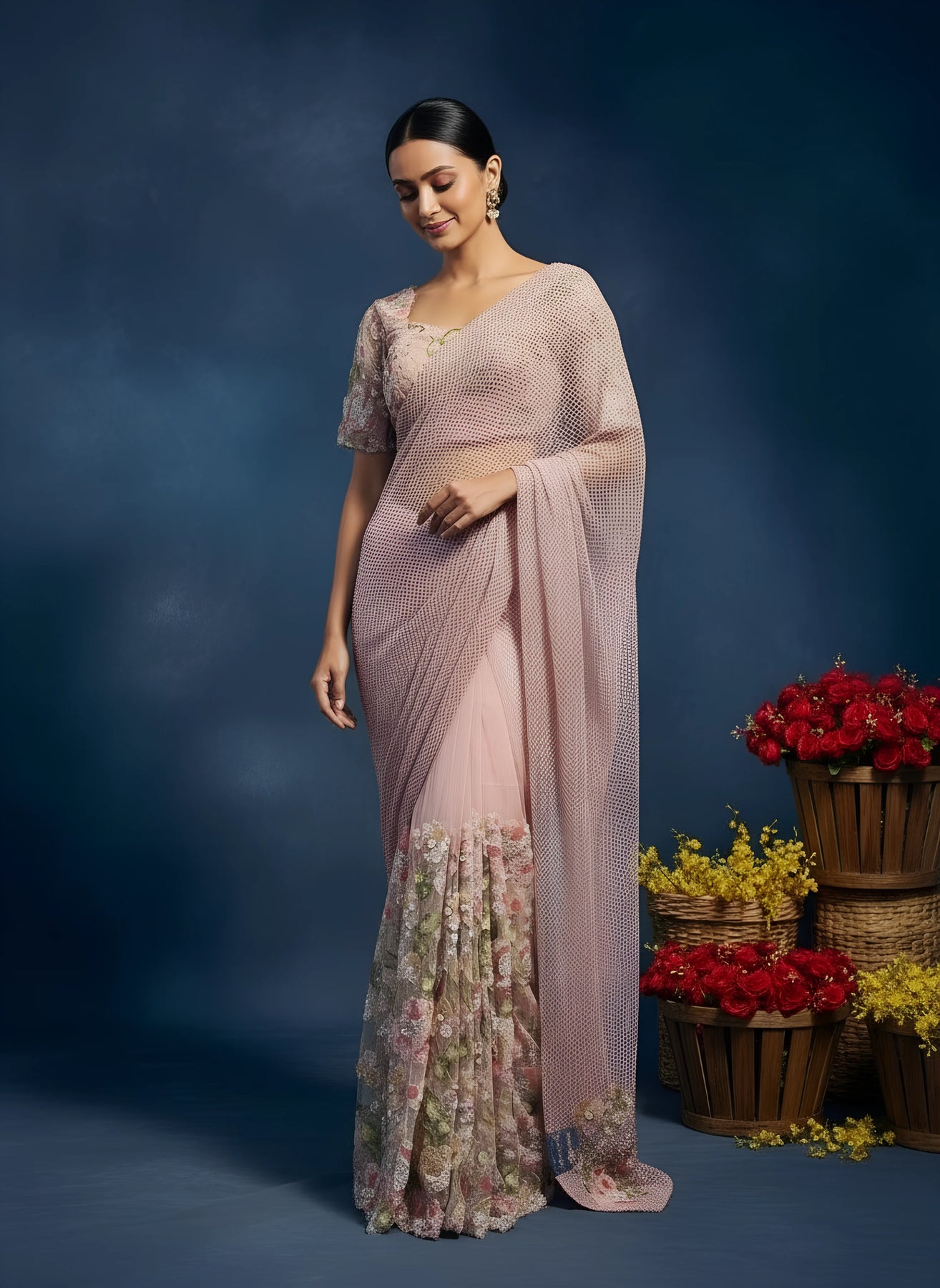 • Pink Net Half & Half Designer Saree With Readymade Blouse