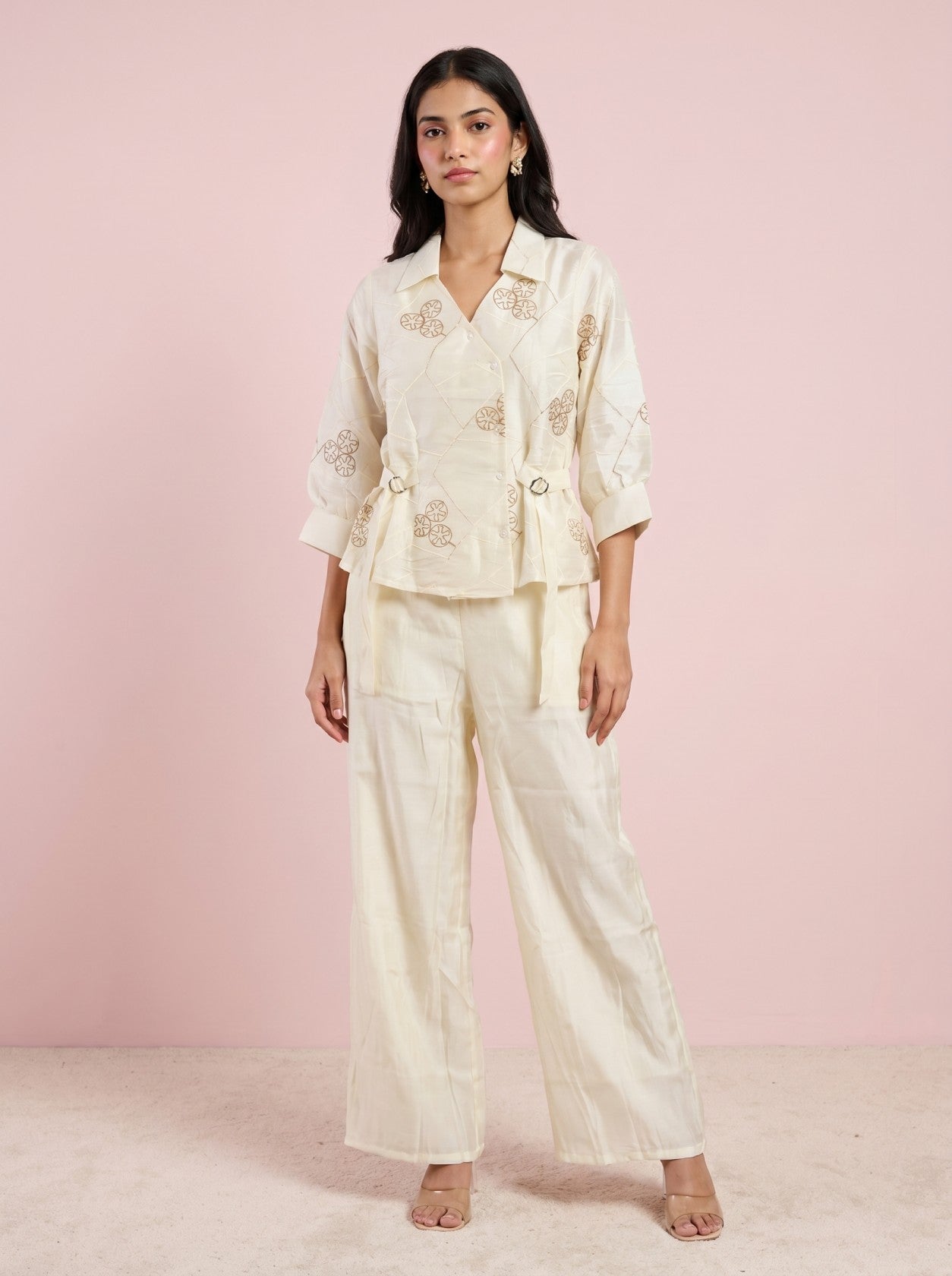 Cream Embroidered Top With Bottom Co-Ord Set