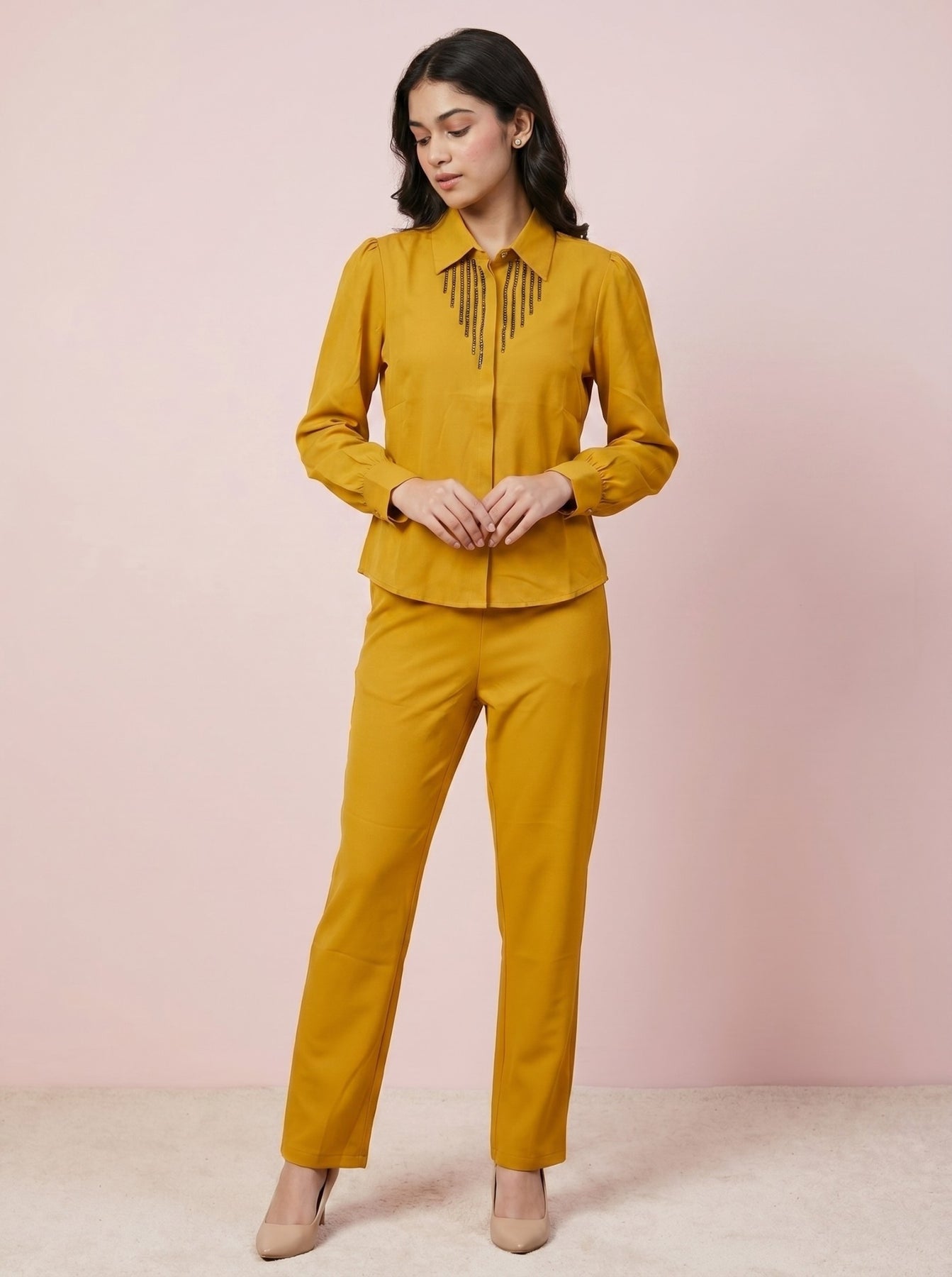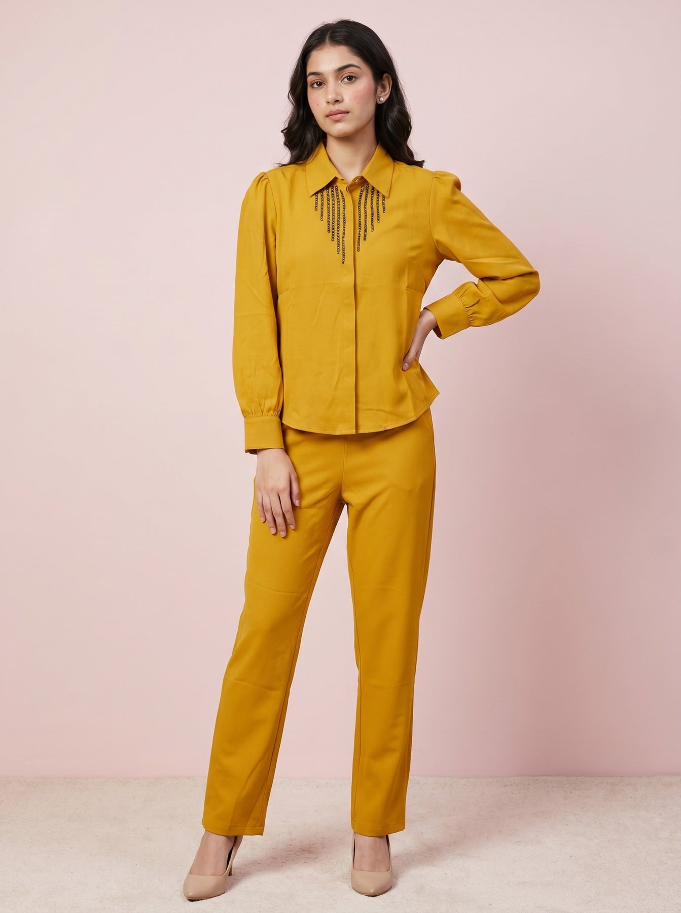 Mustard Flared Sleeve Cotton Embroidered Co-Ord Set