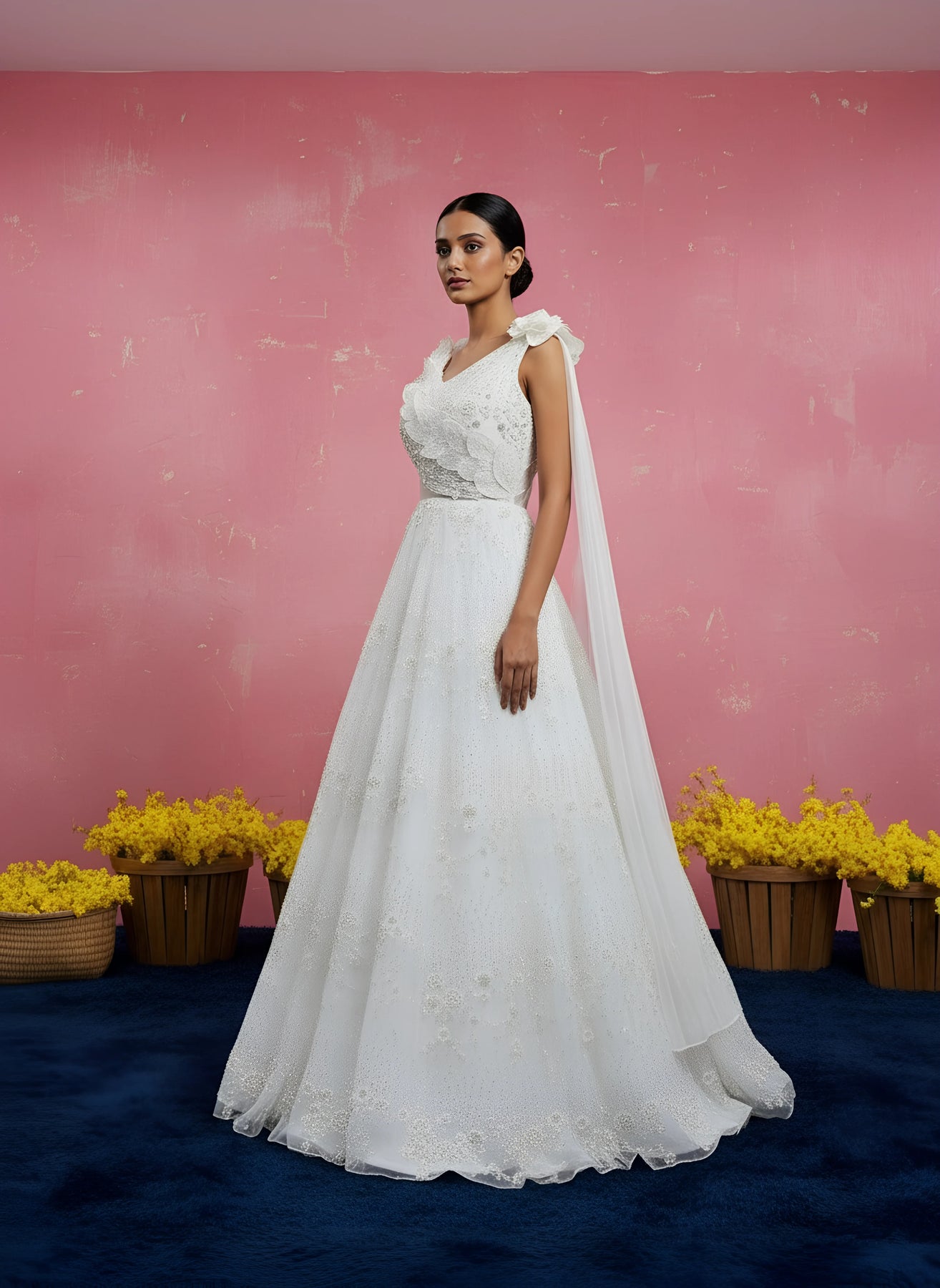Woman in a white gown dress standing against a pink wall with yellow flowers in the foreground.